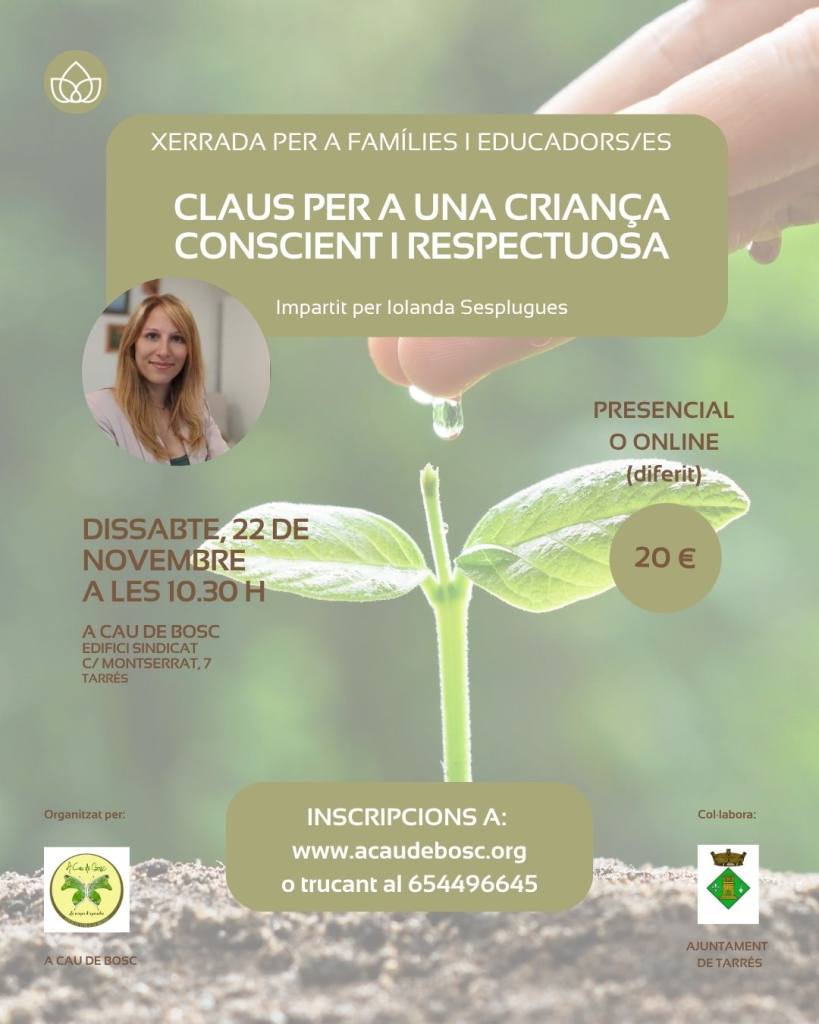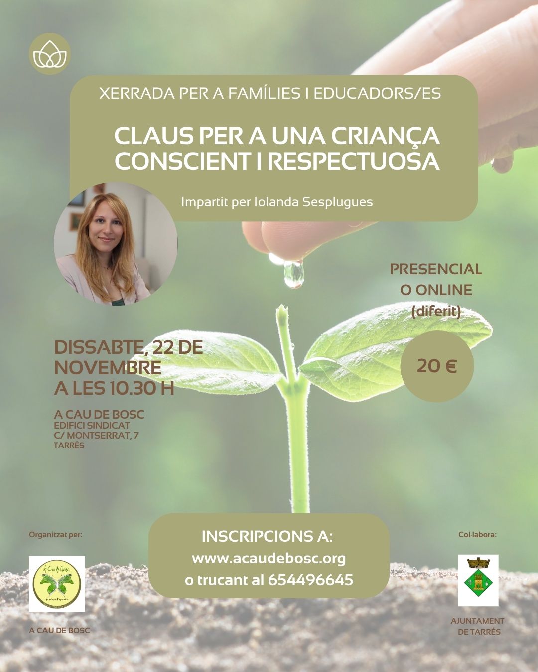 Tothom en parla, però… realment sabem què vol dir criar de manera conscient i respectuosa? En aquesta xerrada, la Iolanda ens ajudarà a posar llum sobre un concepte cada cop més present en l’educació i la criança, oferint claus per comprendre’l i portar-lo a la pràctica, tant a casa com a l’escola.